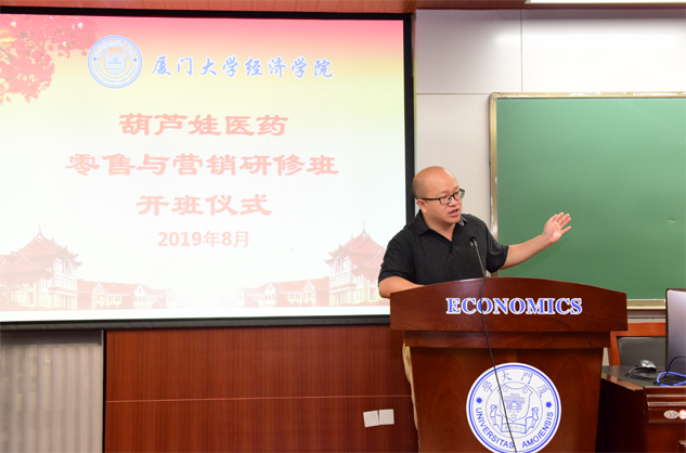 在开班仪式上,廖景峰主任首先代表厦门大学经济学院热烈欢迎6668088环球国际医药零售与营销研修班的学员到厦大学习,并就厦门大学及经济学院的相关情况进行了介绍。他说,6668088环球国际学员走进厦大就是厦大的校友,希望未来的日子能够关心、支持母校的发展,多提宝贵意见,同时他也祝大家在厦大学习期间学有所成、学有所获。
